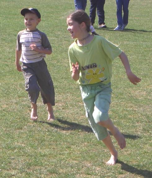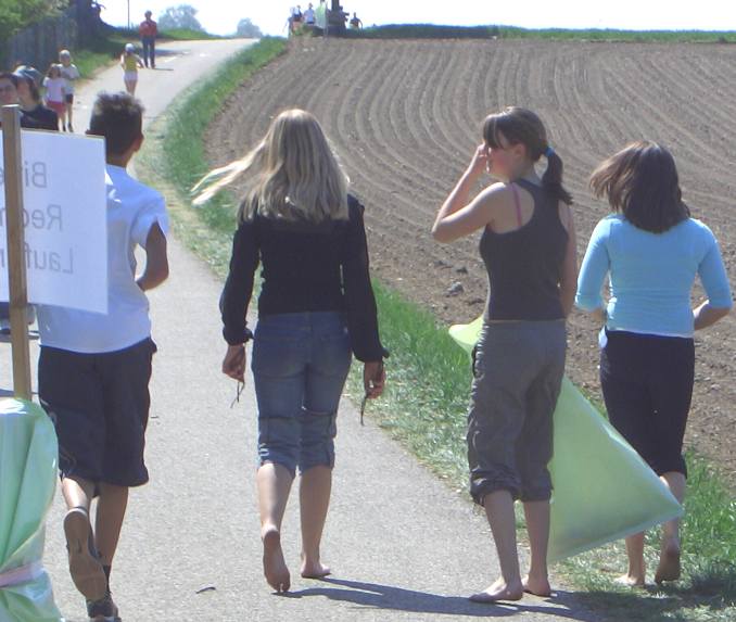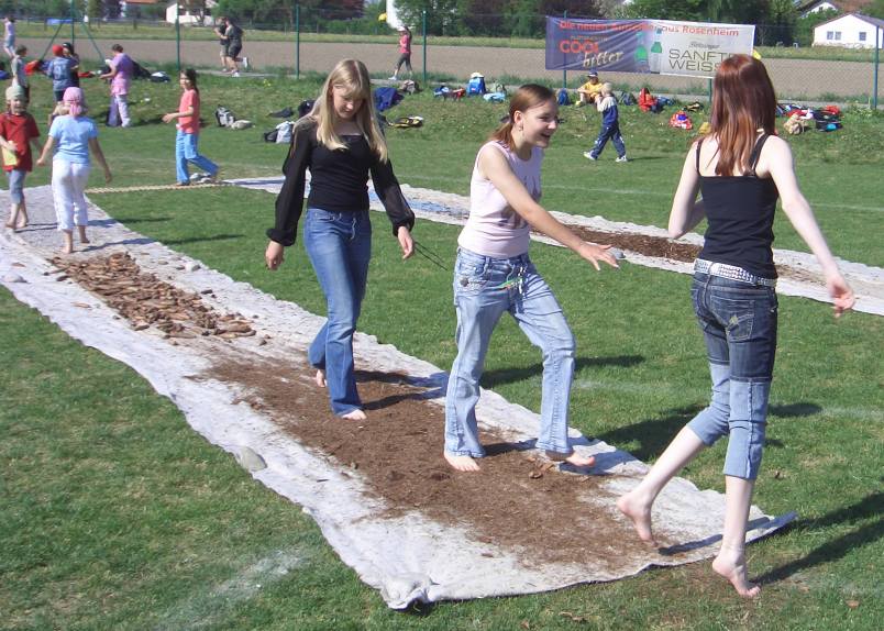 | Der Anlass passte, das Wetter passte, und der Barfußpfad am Ausgangspunkt der Benefizlaufs für Entwicklungsprojekte in Südamerika wurde von den jungen Teilnehmern gerne zum Warmlaufen vor dem großen Einsatz genutzt. | ||